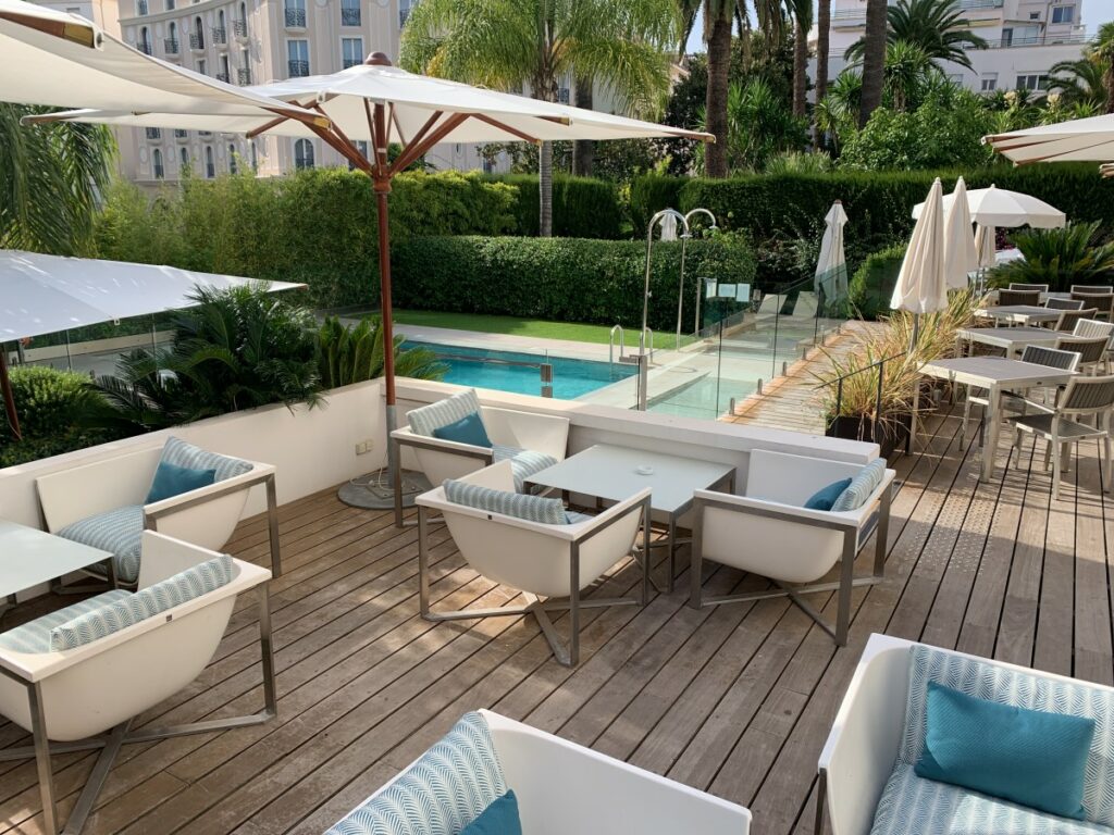 En toute intimité, la terrasse, orientée vers le jardin et la piscine, vous réservent un véritable coin de paradis en plein centre de Cannes.